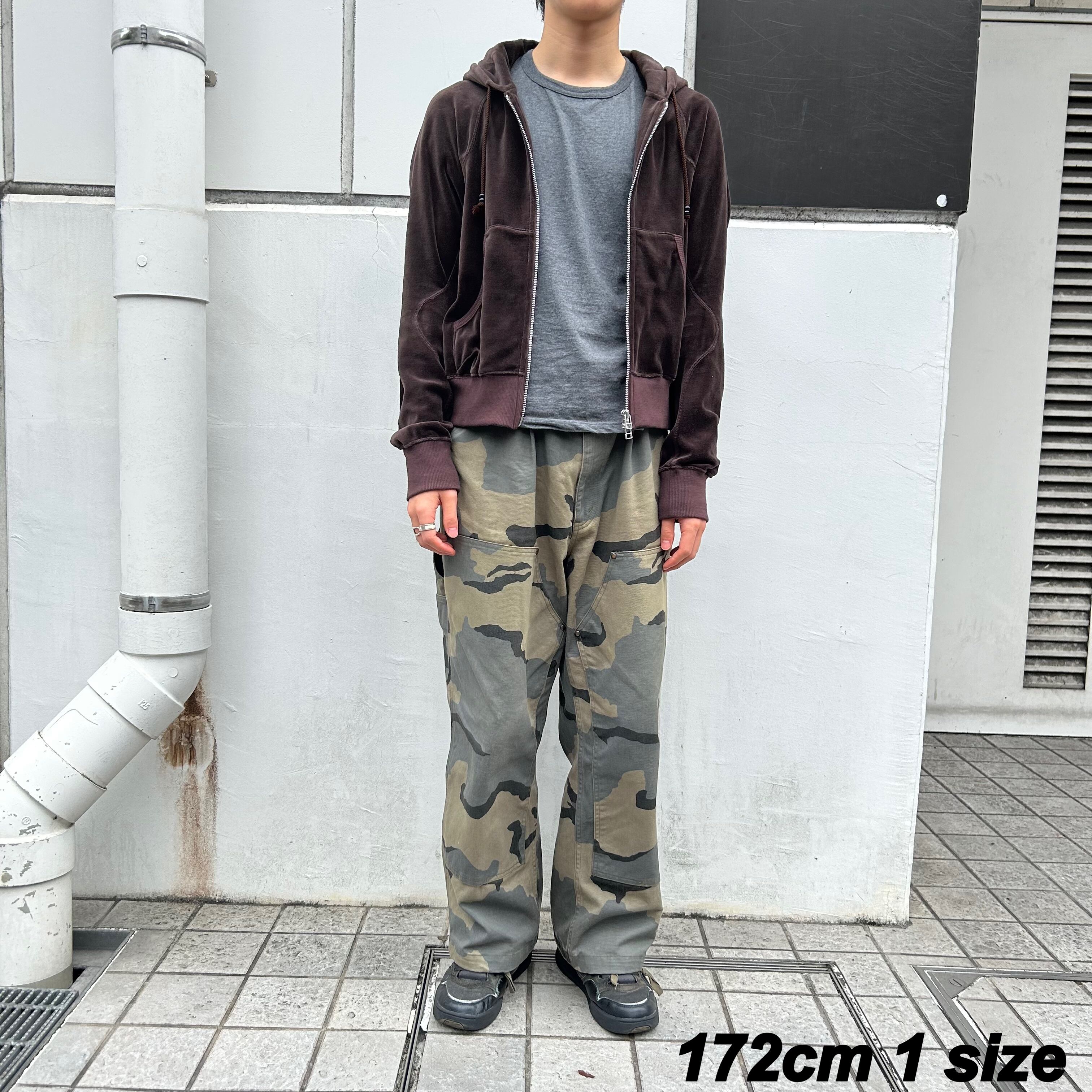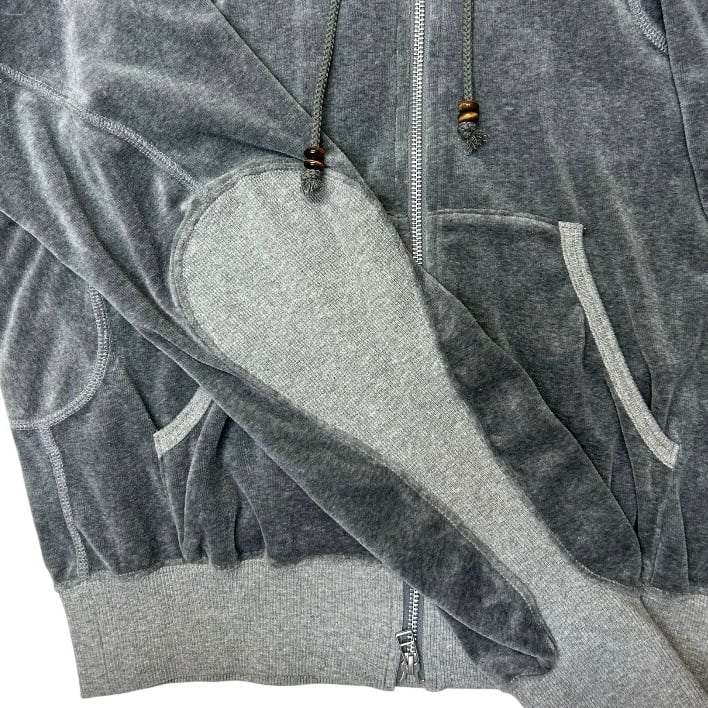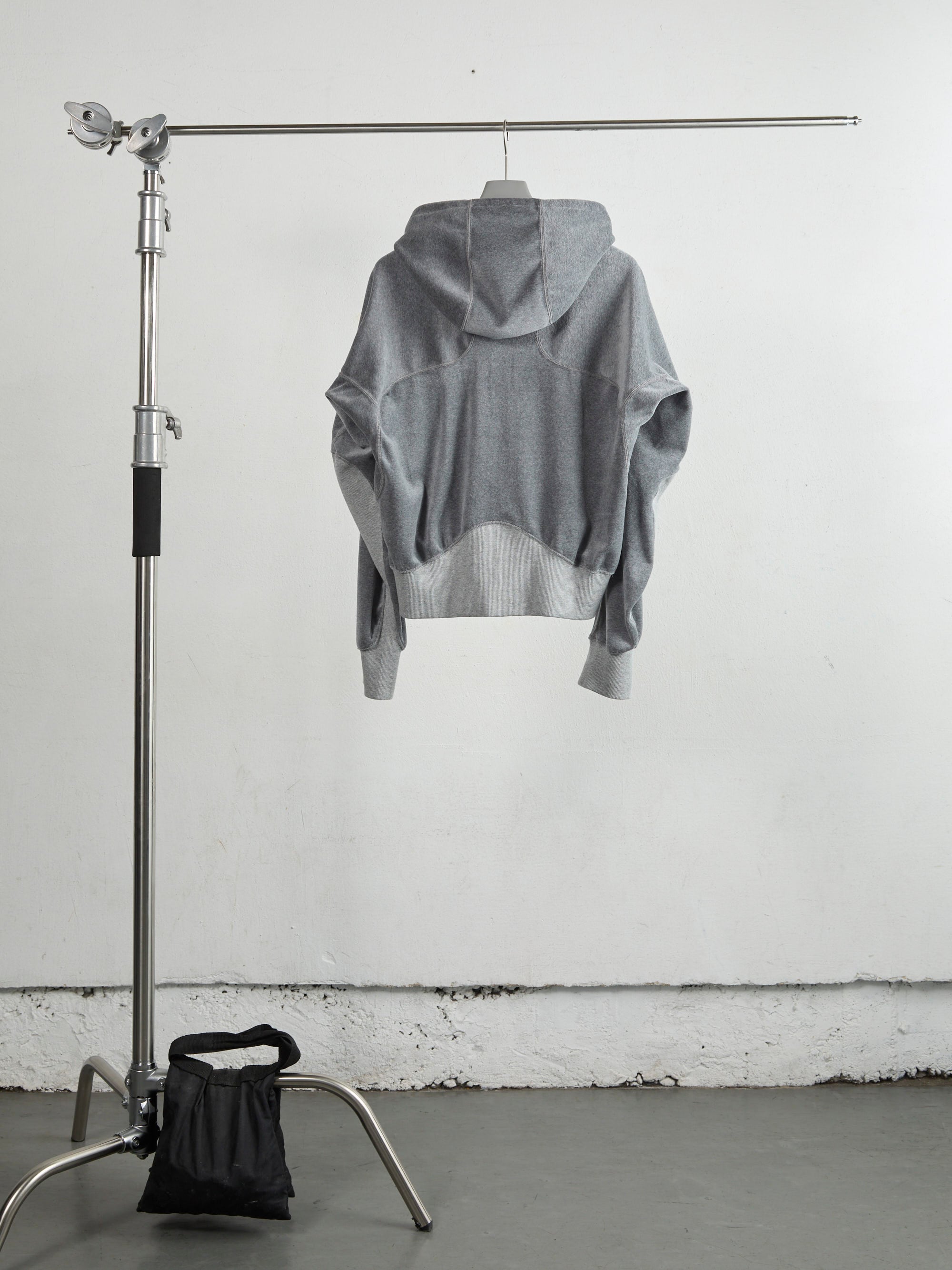 コットンベロアを使用したジップアップフーディー。身巾は程よくゆとりのあるクロップドレングス。変形ピヴォットラグランスリーブに特徴的なリブパネリング。ダブルオープンアルミジッパーフロント。フードコード先端にはオニキスやタイガーアイの天然石ビーズ装飾。フラットシーマー縫製。
