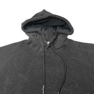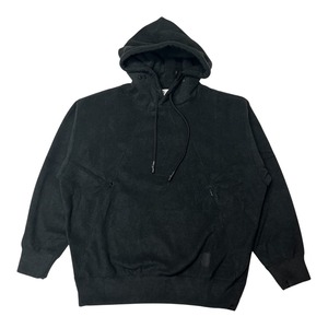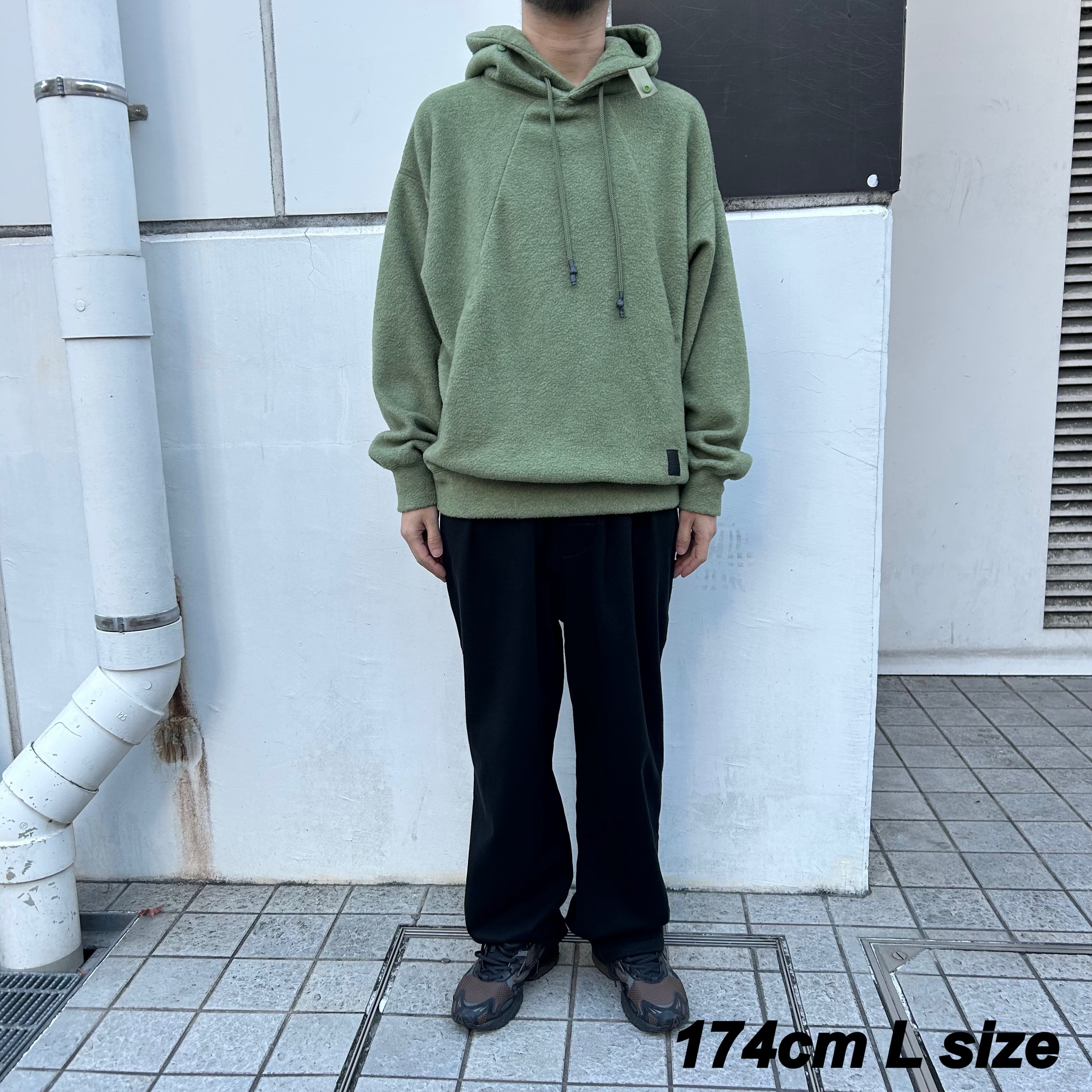O - ® 定番のポリエステル70%レーヨン30%を混紡したフリース素材を使用したフーディです。前身頃に左右2つのコンシールファスナーからアクセスする大型ポケット1つと 袋布内側にモバイル用のミニポケットを2つ配置。ゆったりとした身頃とアームホールに、腕が上げ易い様に設計された袖を付けています。 縫製は(前身頃のポケットを除いて)全てフラットシーマーによるストレスの無い仕様。 袋布は帯電防止機能と紫外線により発熱する機能を併せ持った特殊なポリエステルメッシュ地を使用しました。