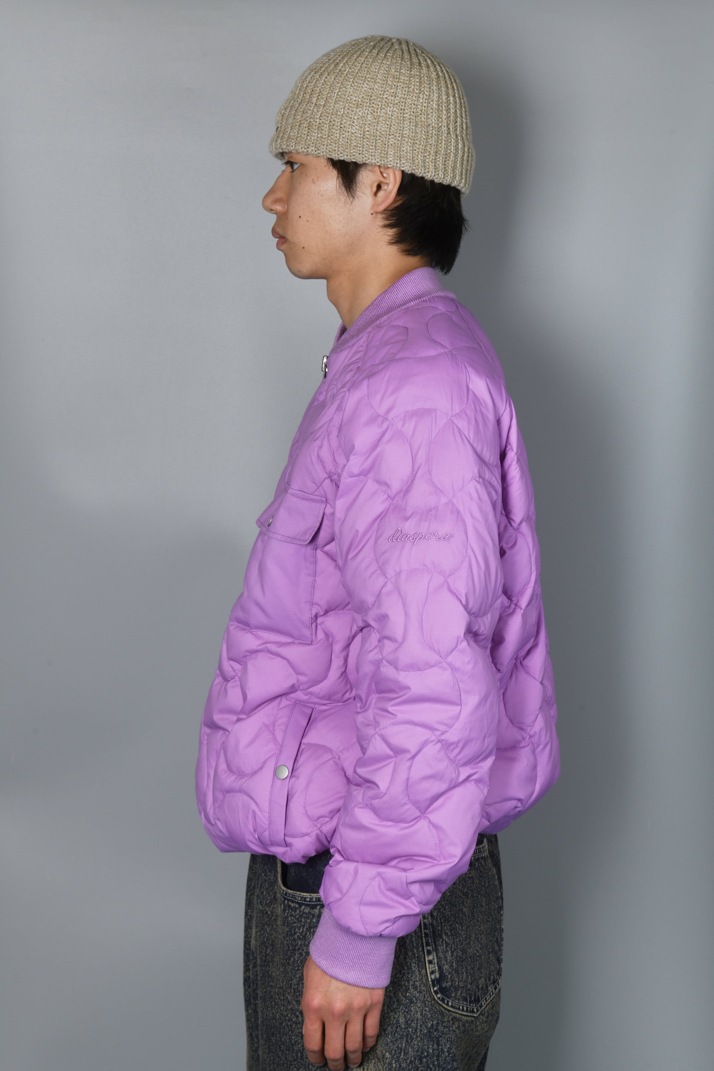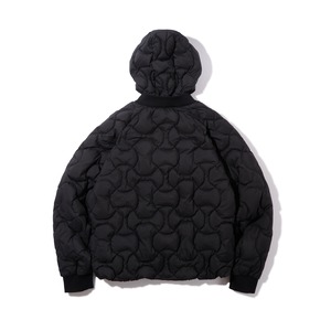 ミリタリーコートなどのライナーのステッチで見られるミリタリーキルトを垂直に重ね合わせたキルティングがアイコニックなダウンジャケット。