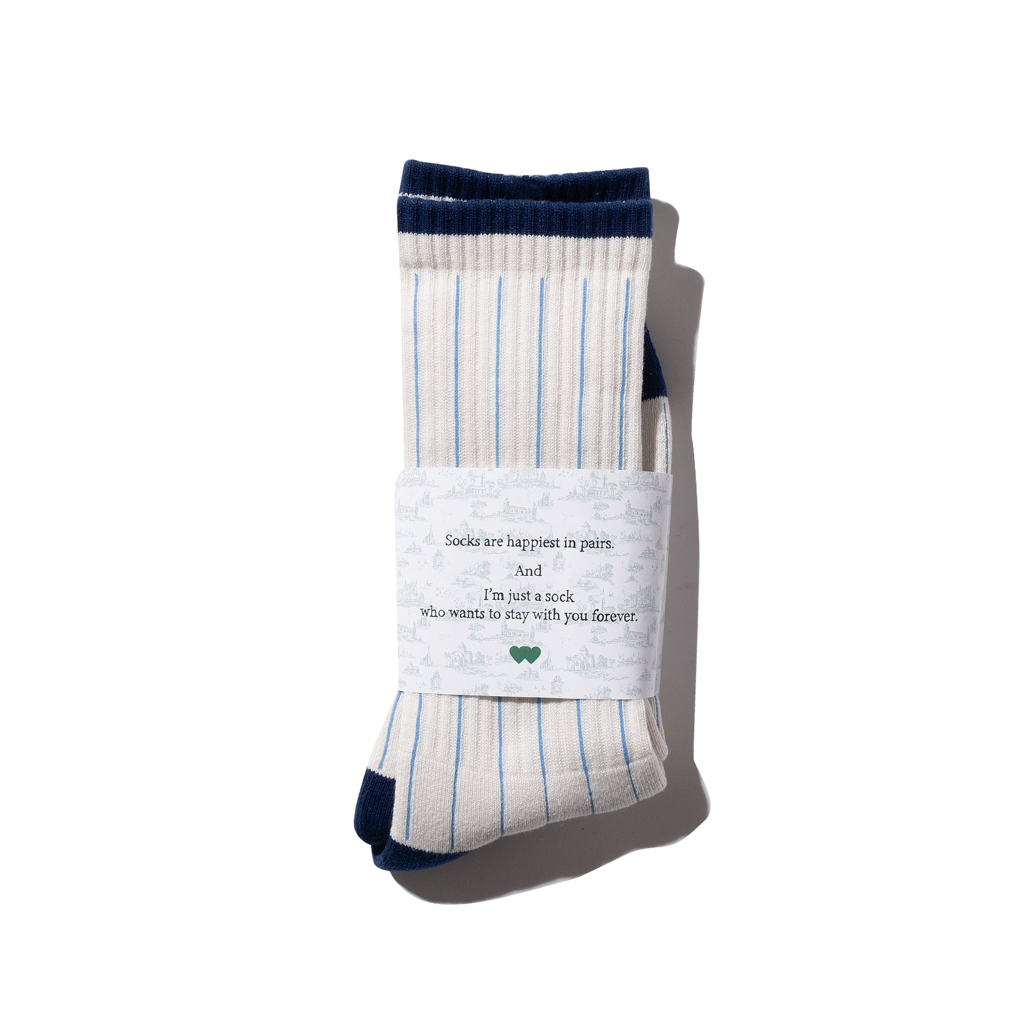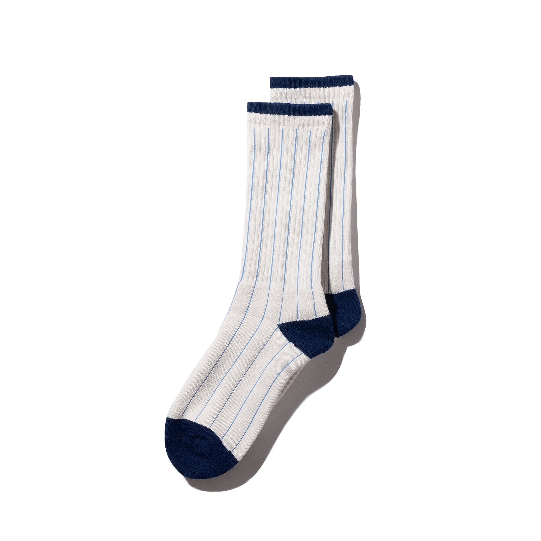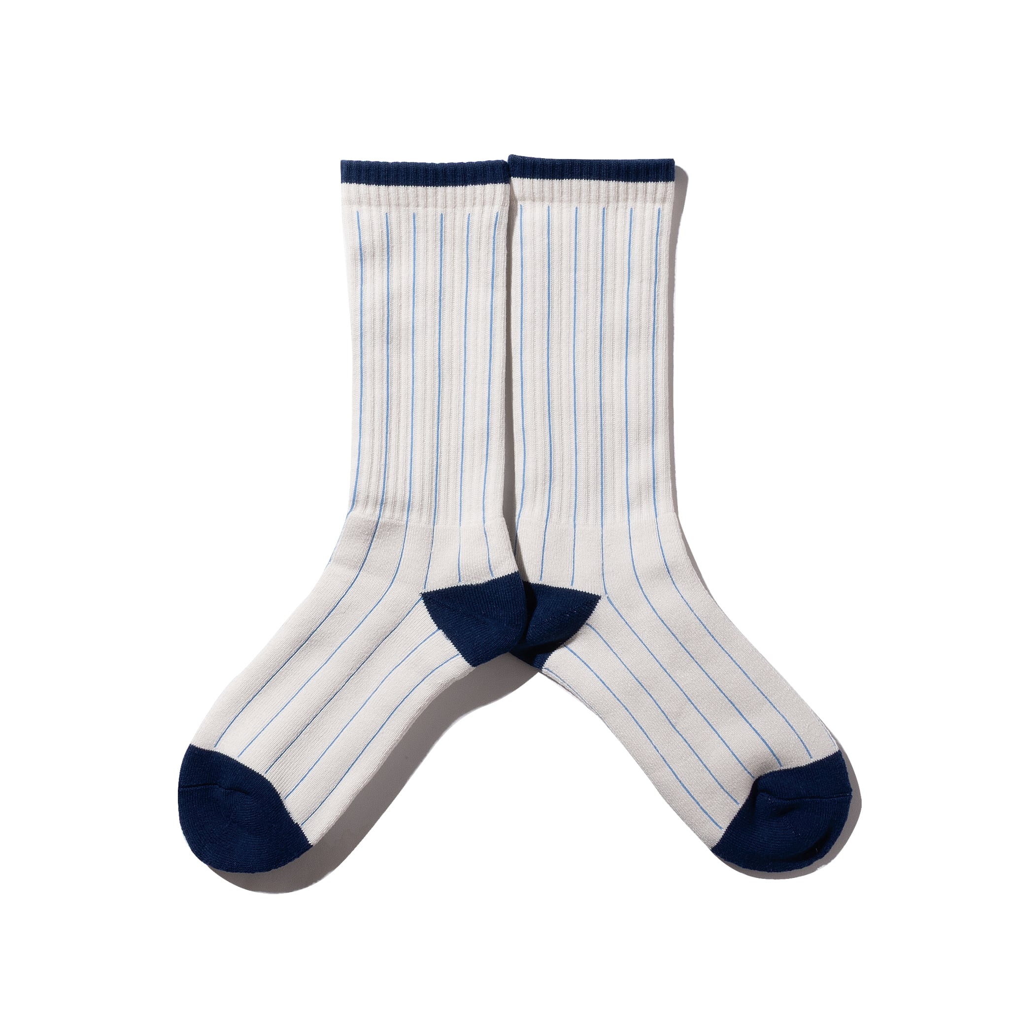 ストライプ柄で編み立てた程良い厚さのリブ編みソックス。
