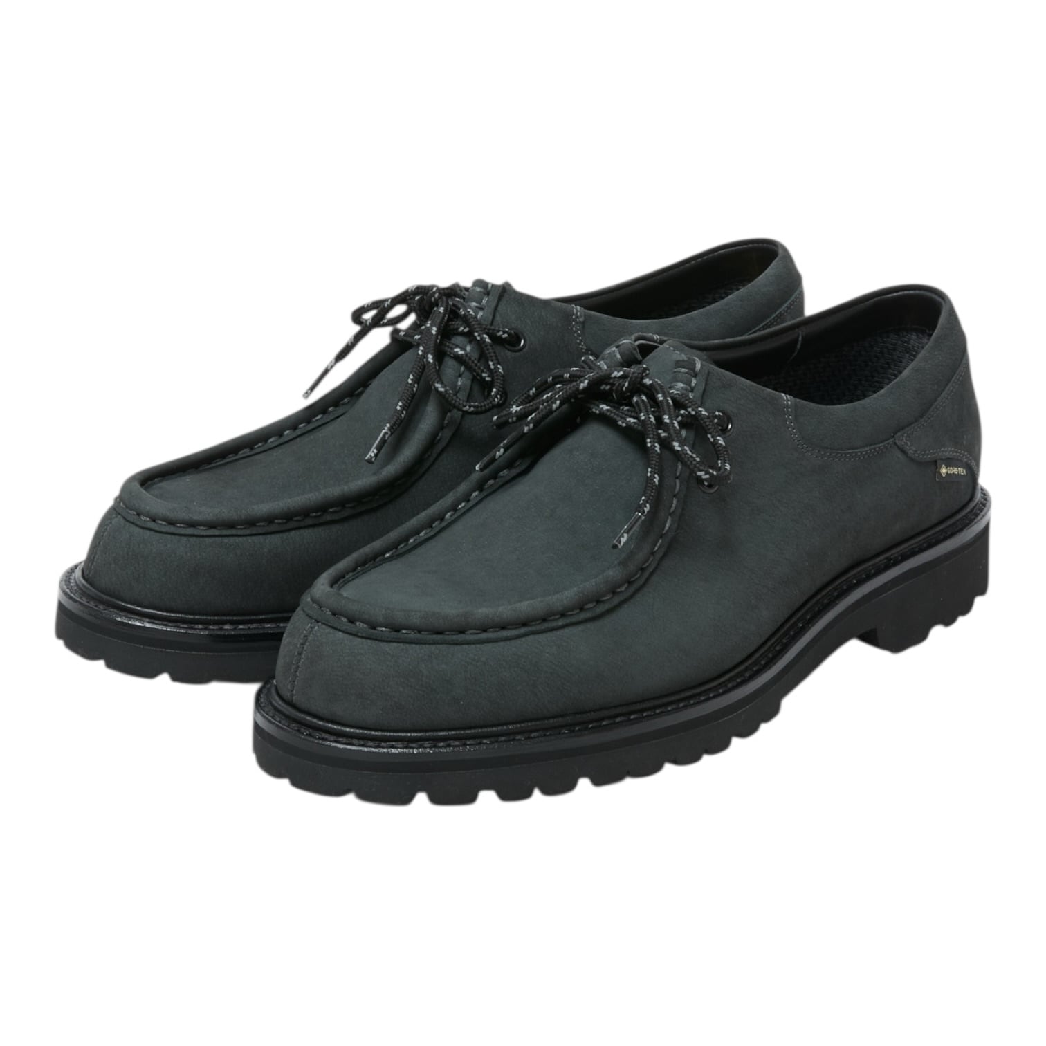 日本発のシューズブランド<REGAL SHOE &CO>とのコラボレーション。チロリアン型ベースに、ヌバックレザーにGORE-TEX®︎を搭載。軽量のコマンドソールVIBRAM ニューフレックス使用。リフレクター入りシューレースとブラックレースのエクストラレース付き。