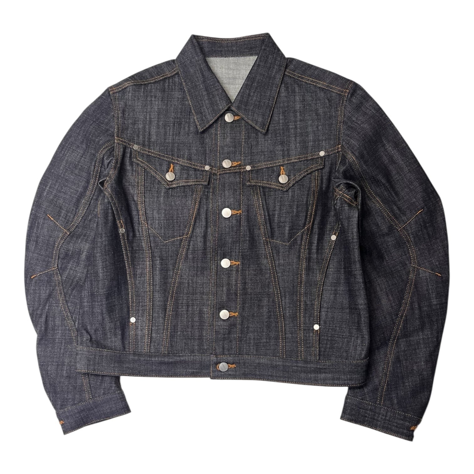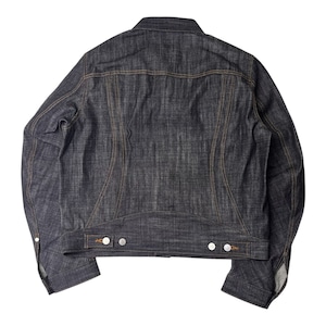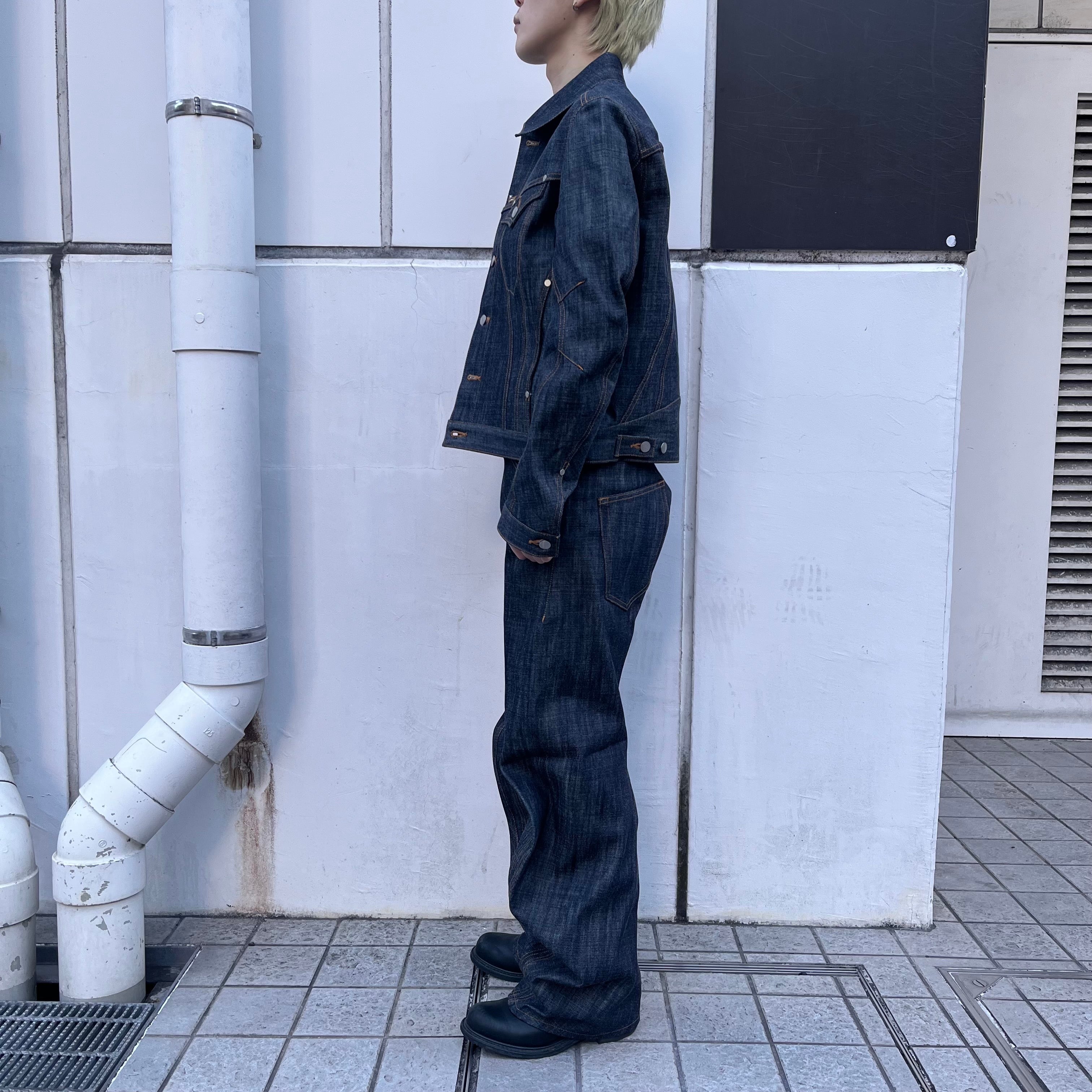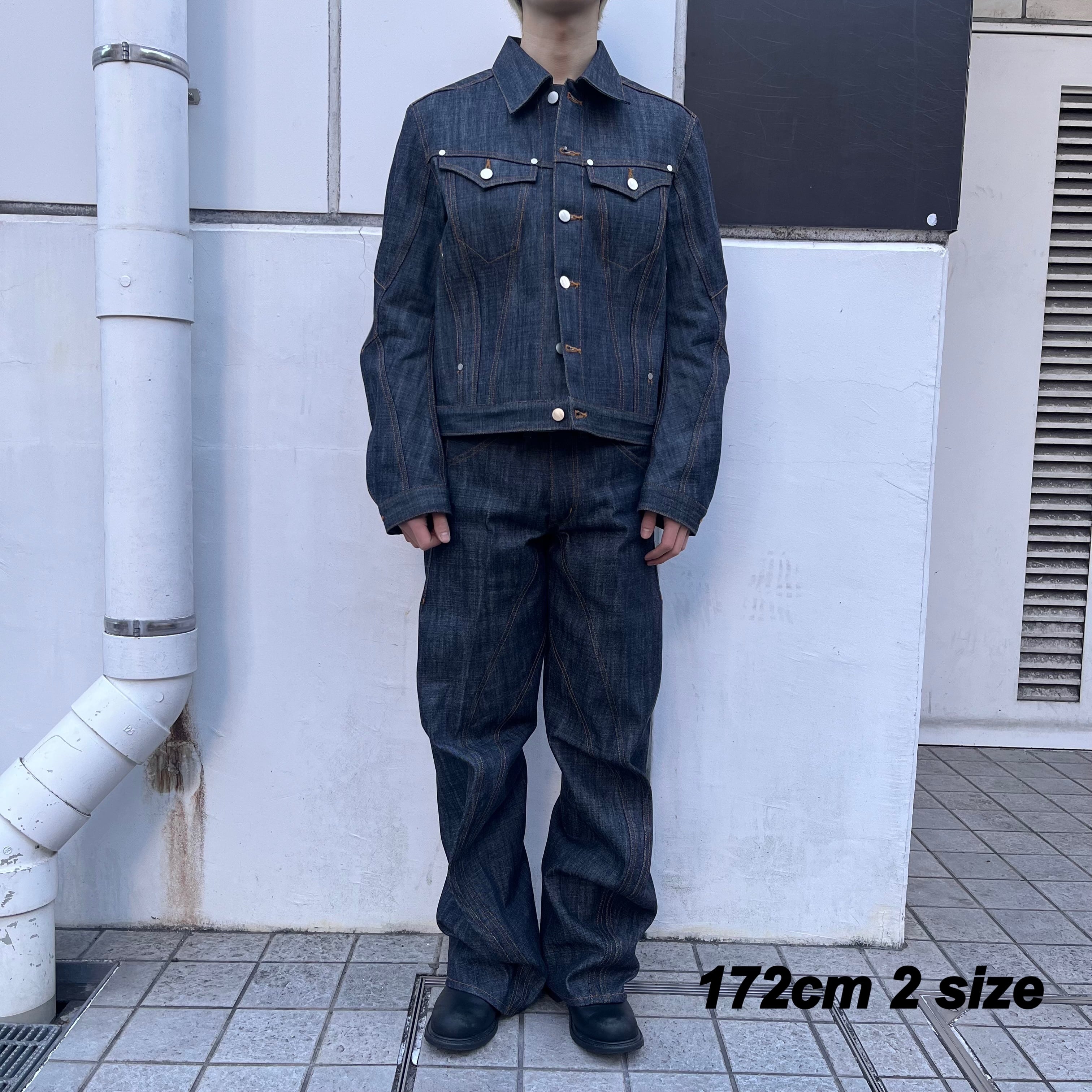 13ozナチュラルスラブ ローテンション織りデニムを使用。立体裁断を施したトラッカージャケット。レギュラーフィットでクロップドレングス。立体的なパターンカットでカーヴィーなシームラインとレーシングウェアを彷彿させるカッティングの前振りに湾曲したアームが特徴的なデザイン。タック釦とリベットはレーザー彫刻によるオリジナルパターン入り。