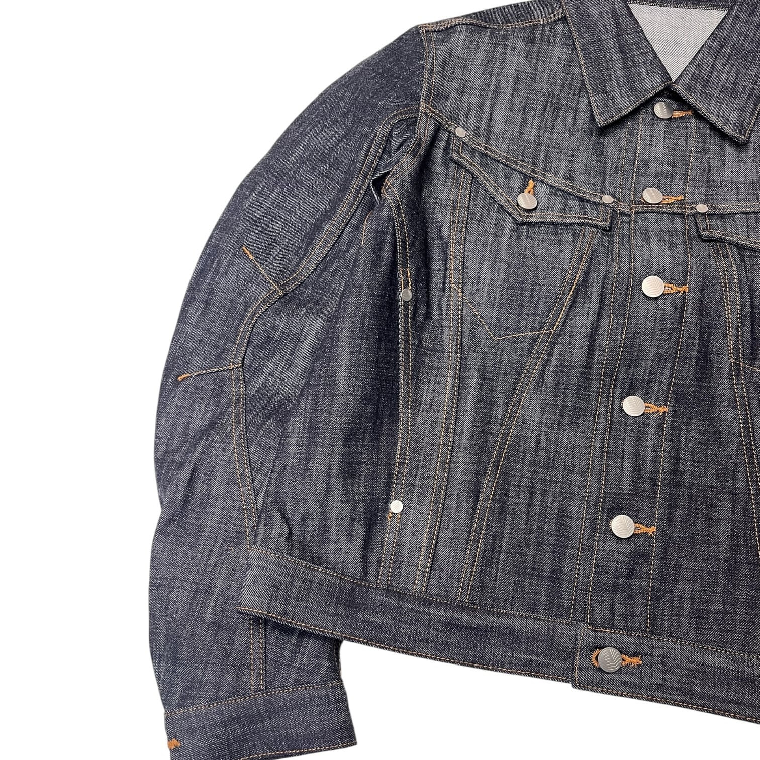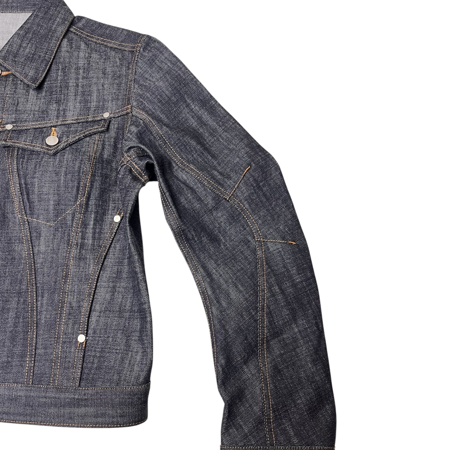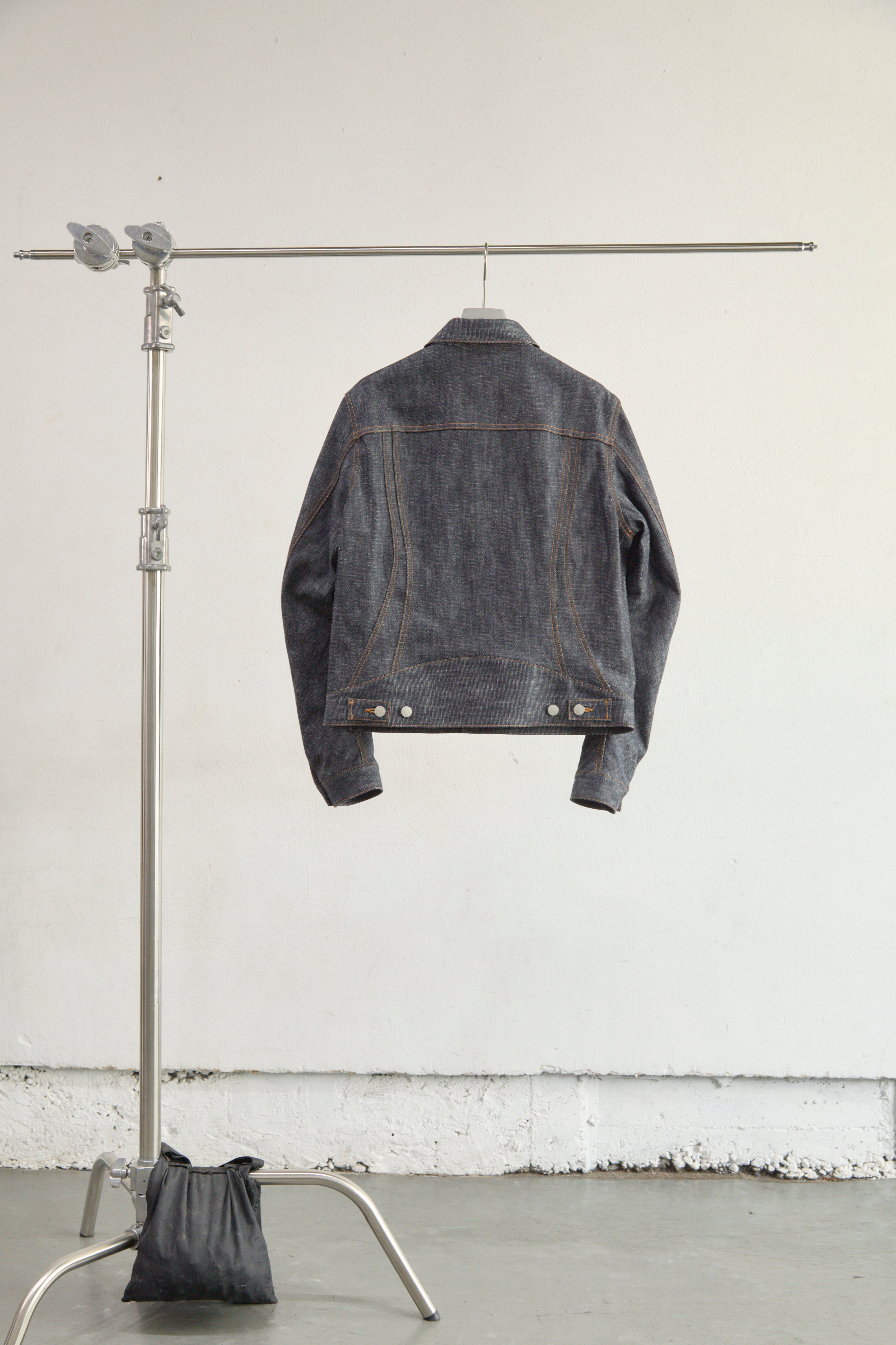 13ozナチュラルスラブ ローテンション織りデニムを使用。立体裁断を施したトラッカージャケット。レギュラーフィットでクロップドレングス。立体的なパターンカットでカーヴィーなシームラインとレーシングウェアを彷彿させるカッティングの前振りに湾曲したアームが特徴的なデザイン。タック釦とリベットはレーザー彫刻によるオリジナルパターン入り。
