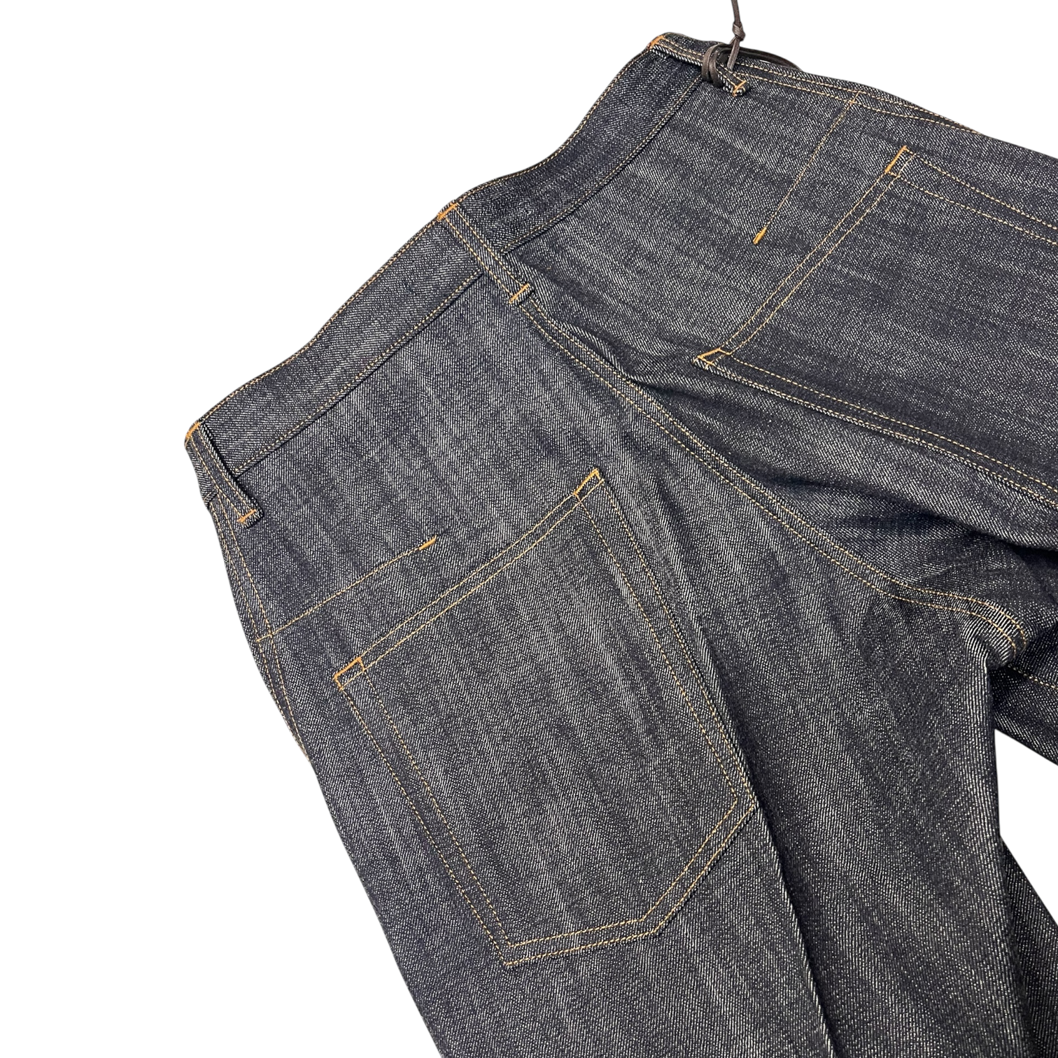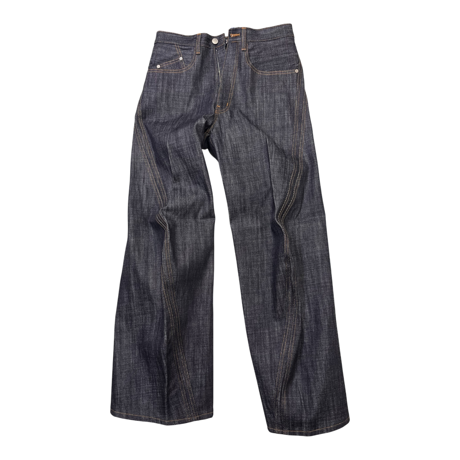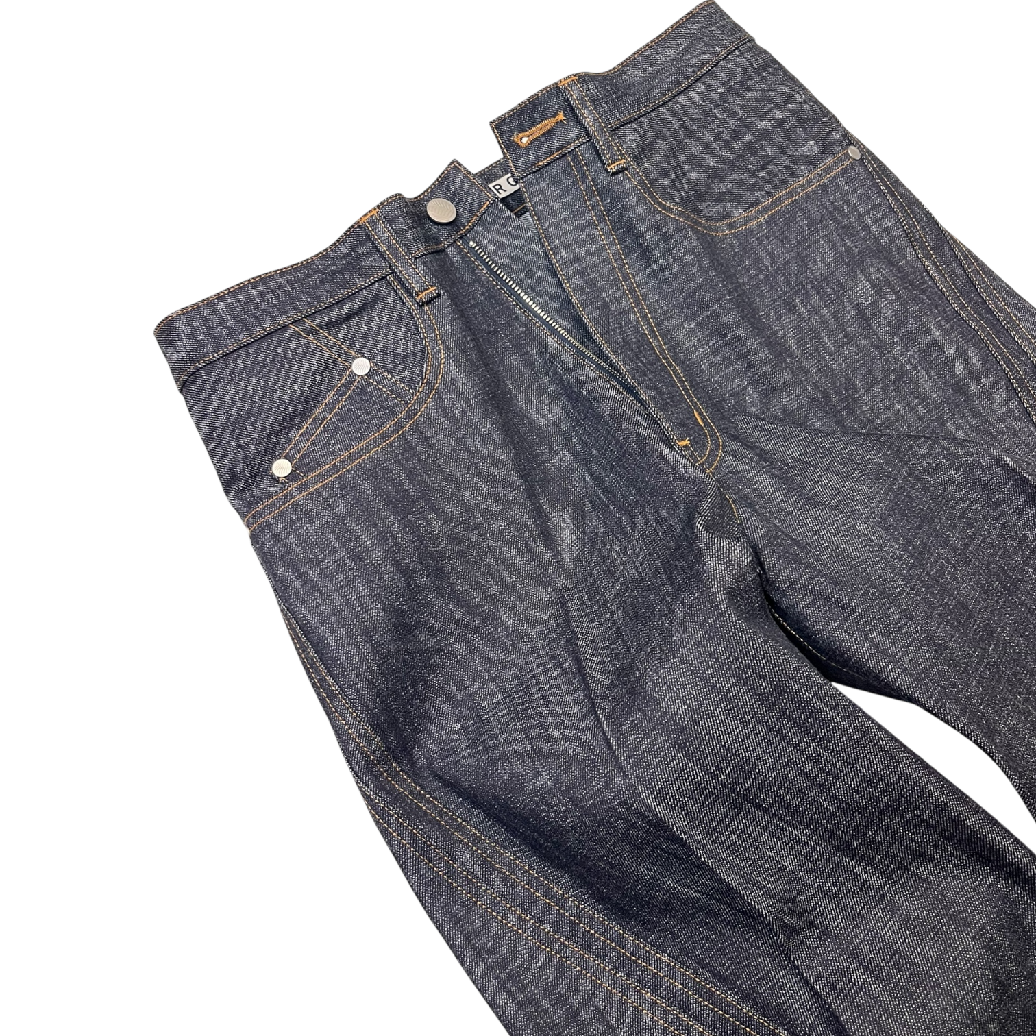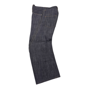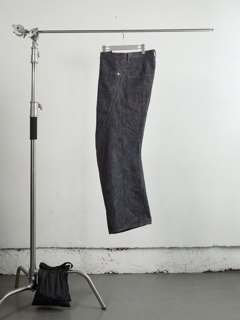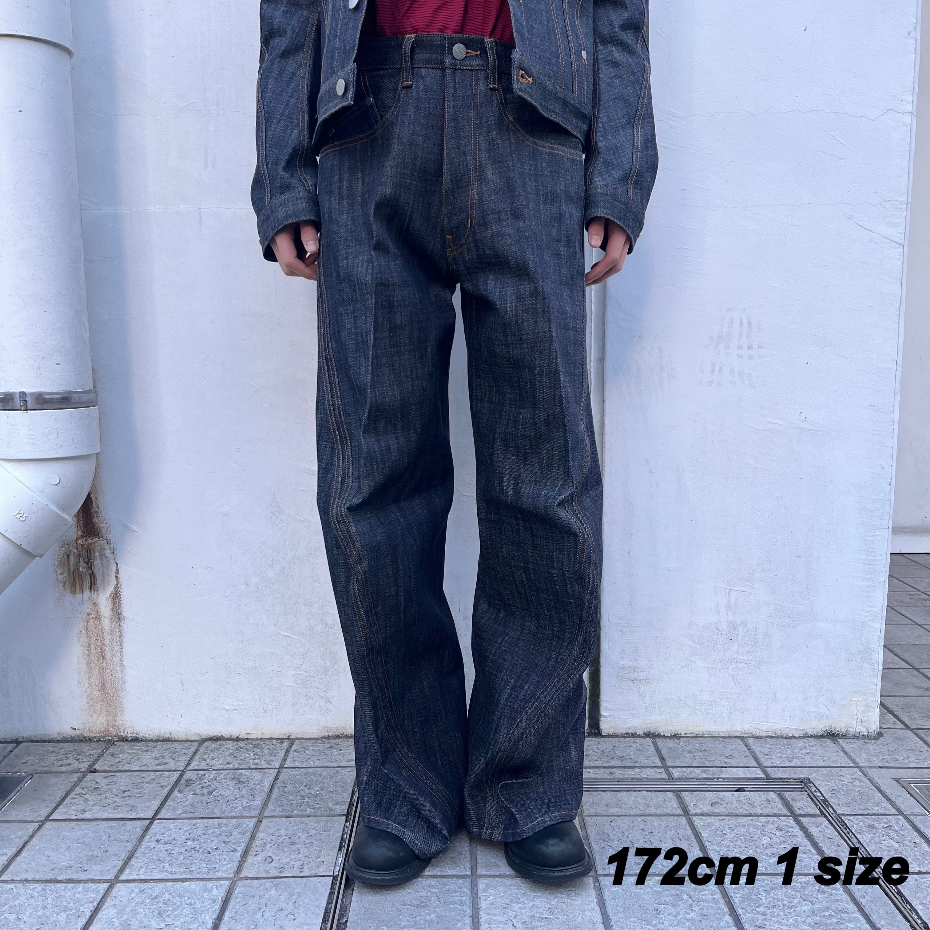 13ozナチュラルスラブ ローテンション織りデニムを使用したワイドシルエット立体裁断ジーンズ。00's初期に見られた立体裁断ジーンズから着想し現代的なシルエットにアップデートしました。人間工学に基づいた立体裁断で3Dパターンメイキングを駆使し、膝や足回りの動きやすさを解放する為にサイドシームが大きく捻じれたデザインが特徴です。サイドシームを二重に入れる事で視覚、構造共に立体的なシルエットを強調しています。タック釦とリベットはレーザー彫刻によるオリジナルパターン入り。定番展開しているシグネチャーアイテムです。