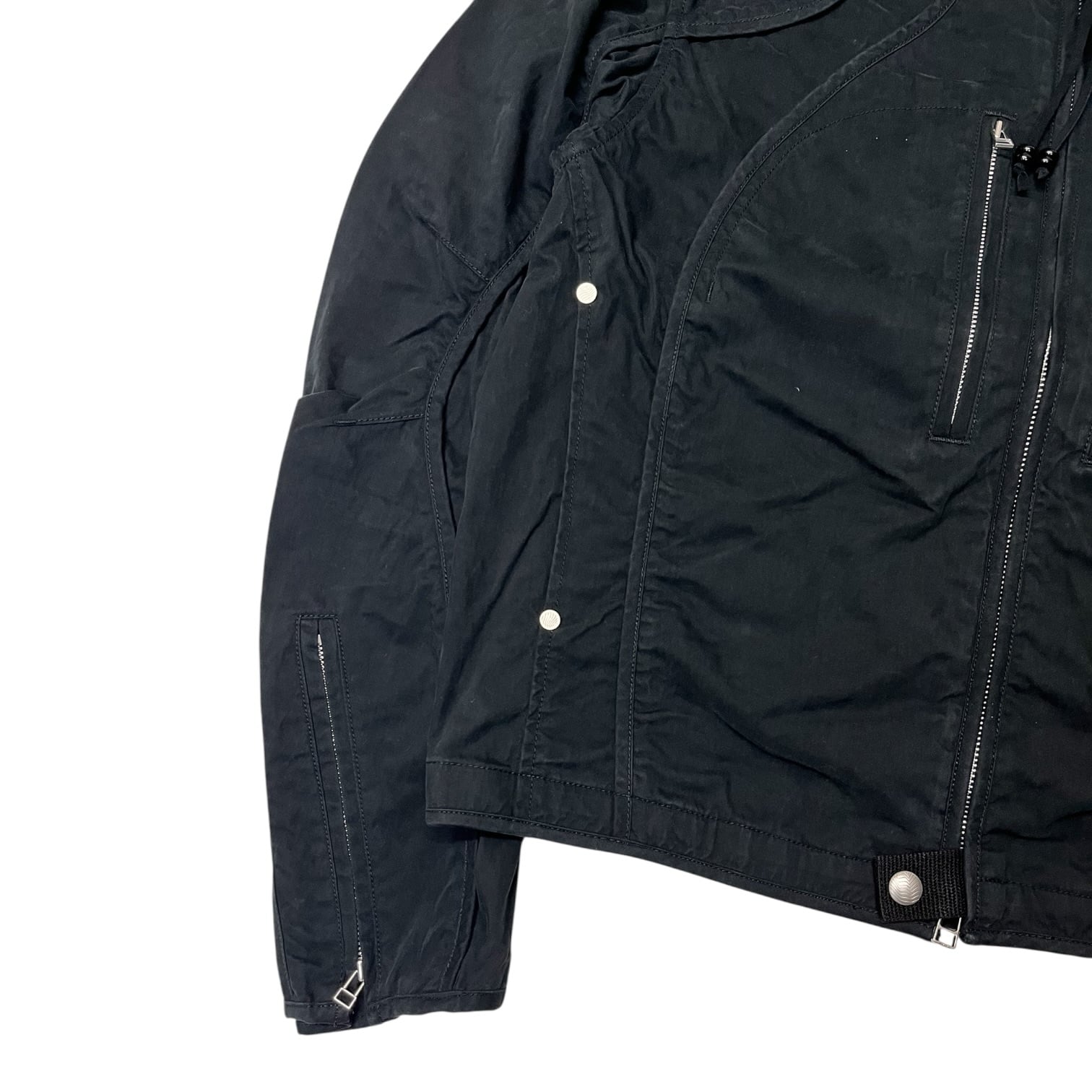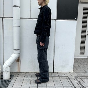 製品バイオストーンウォッシュ加工。クロップドレングスでダブルジッパーフロント。パイピングを施したパネリングデザインが特徴。レーザー彫刻によるオリジナルパターン入りスナップ釦。フロントジップ先端にはオニキスやタイガーアイの天然石ビーズ装飾。