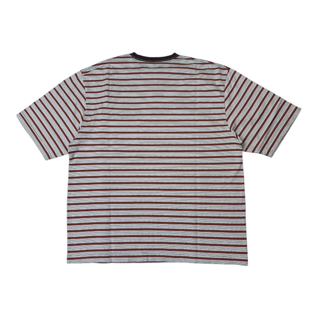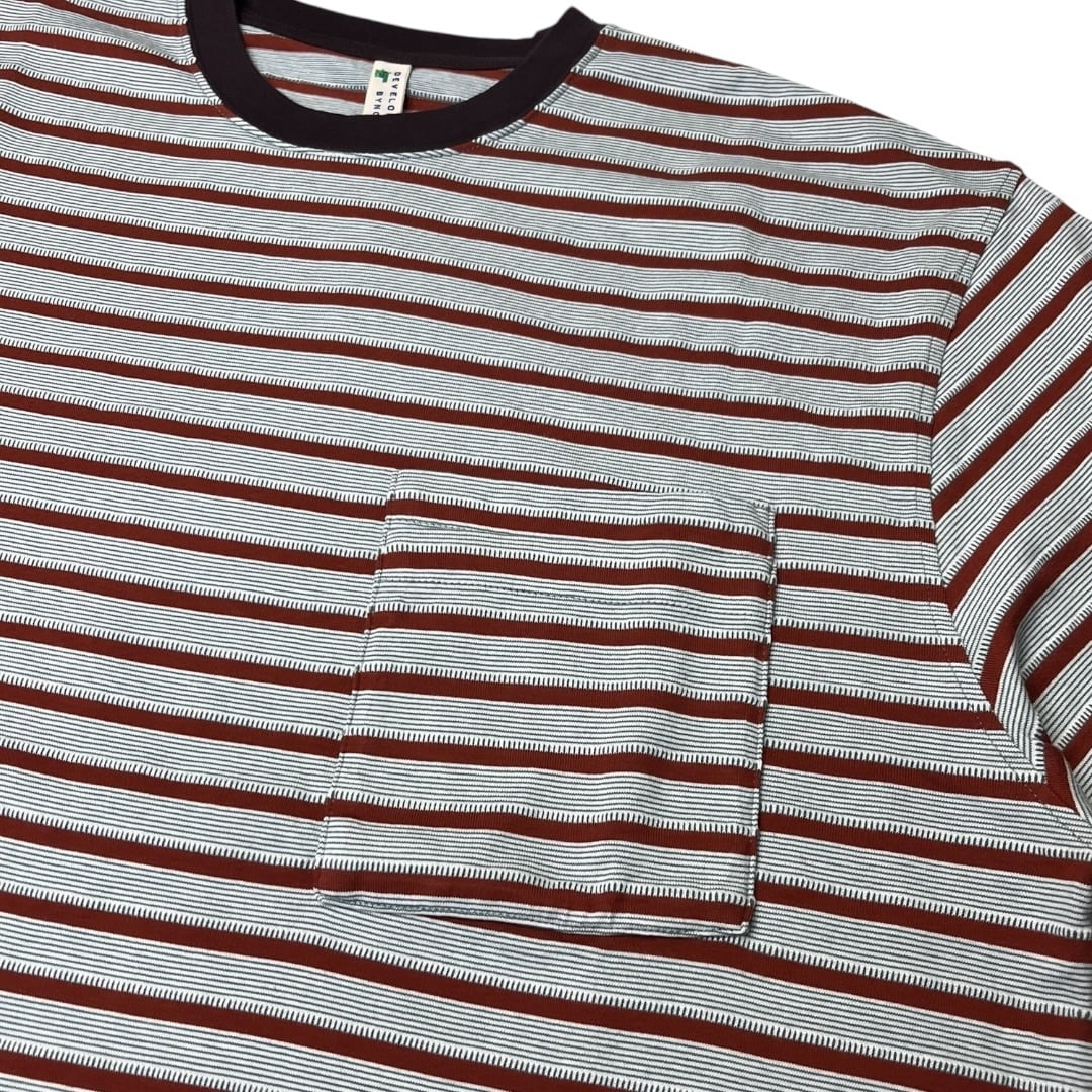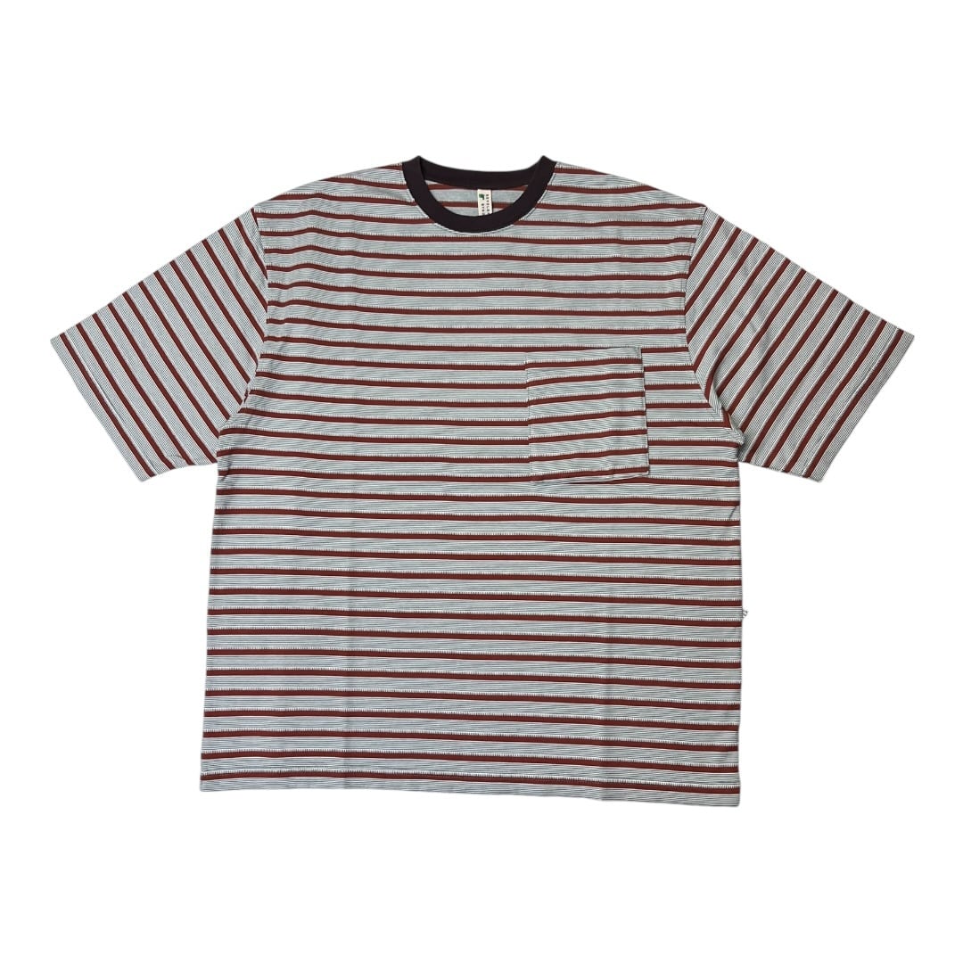 オリジナル生地のボーダー+ジャガードの Teeベースのカットソーを細み立てた上からを線部分をジャガードで加工している凹凸あるオリジナル生地。ポケットはダブルポケット。タンブラーをかける事で偶然生まれるカットソーとジャガードの縮率差による不均一な凹凸が特徴。