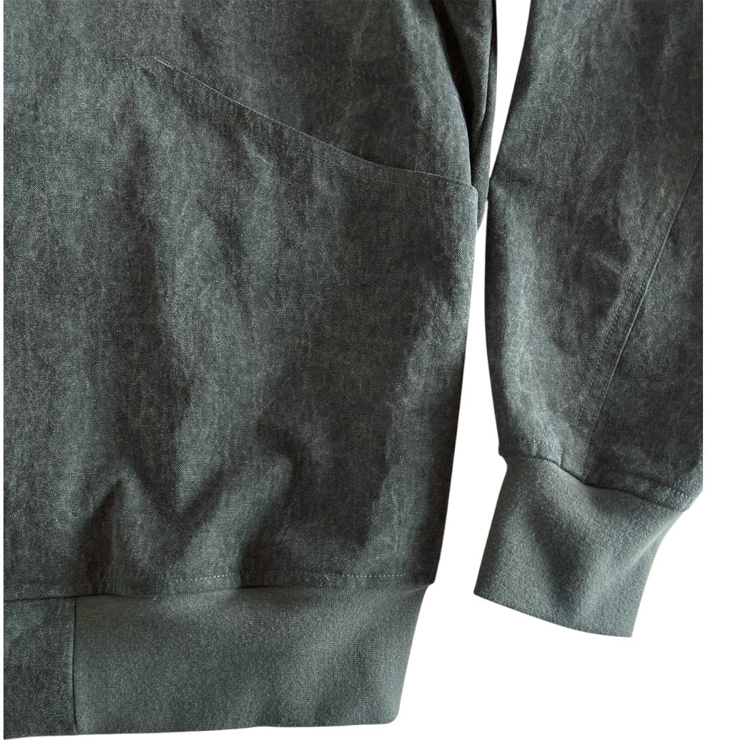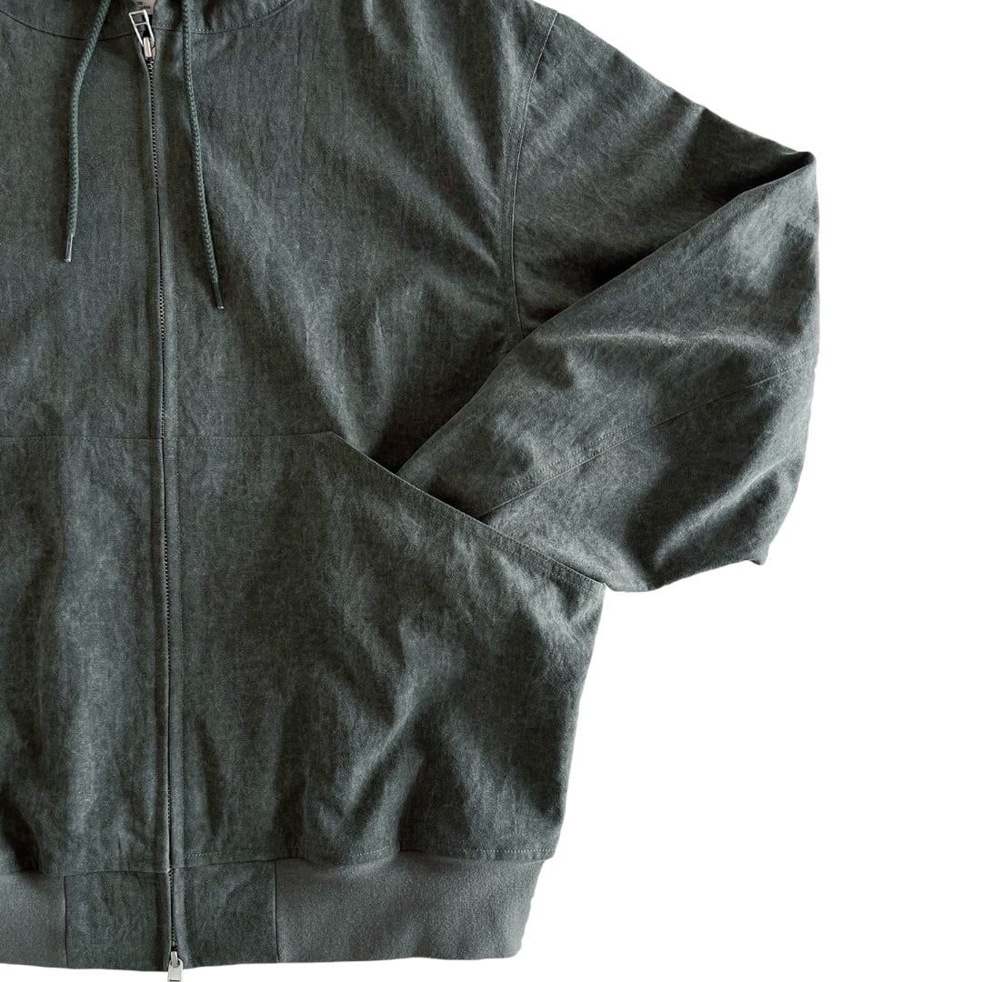 天然ライクなナイロン素材を使用したフードジャケット。 片面を顔料コーティング後にワッシャー加工が施された 独特なエイジング感のある素材を採用。 フロントはWファスナー開きで脇まで続く深さのあるポケットにより 物落ちを防止しアクティブな場面にも対応。 背面にはベンチレーションを配置し通気性も兼ね備えたアイテム。