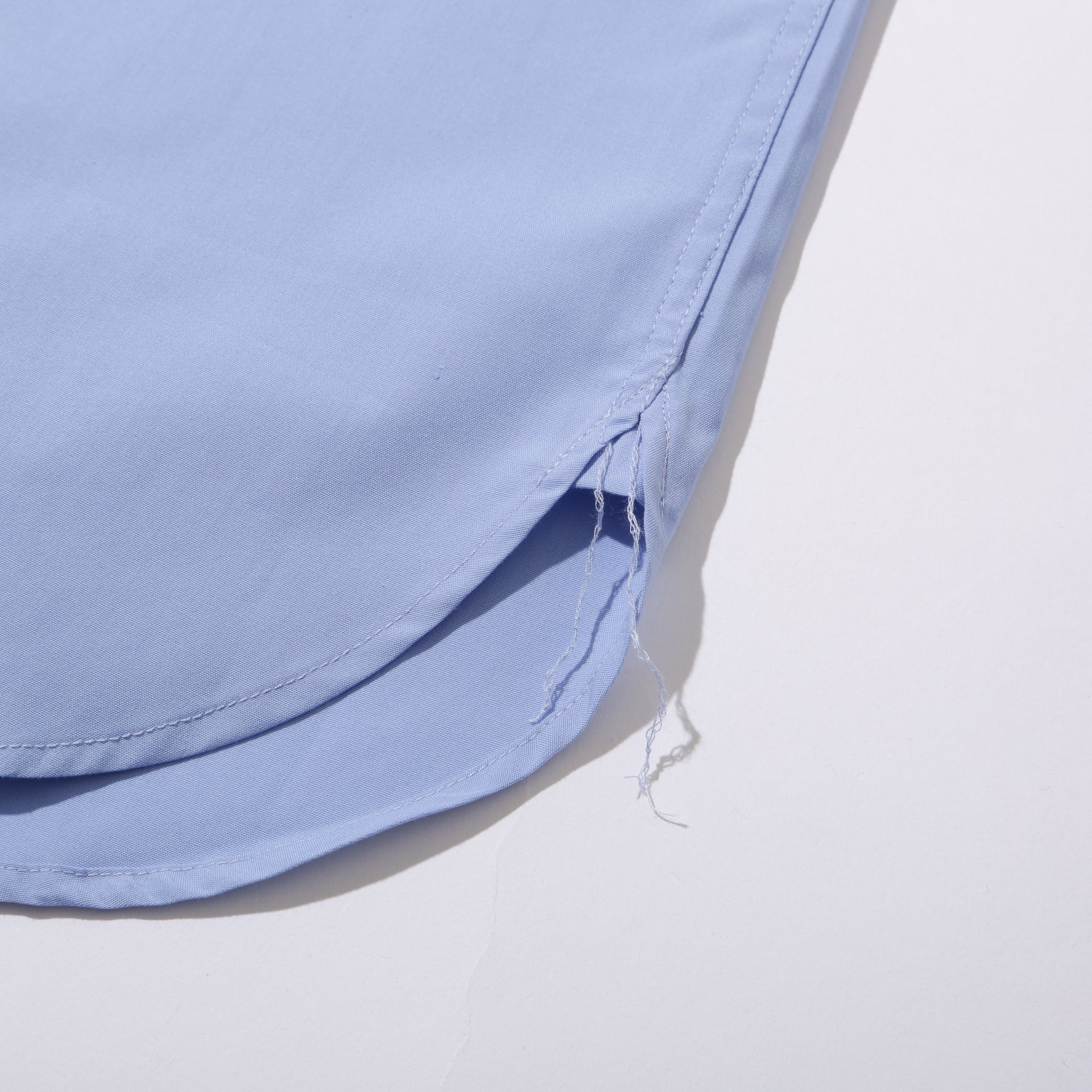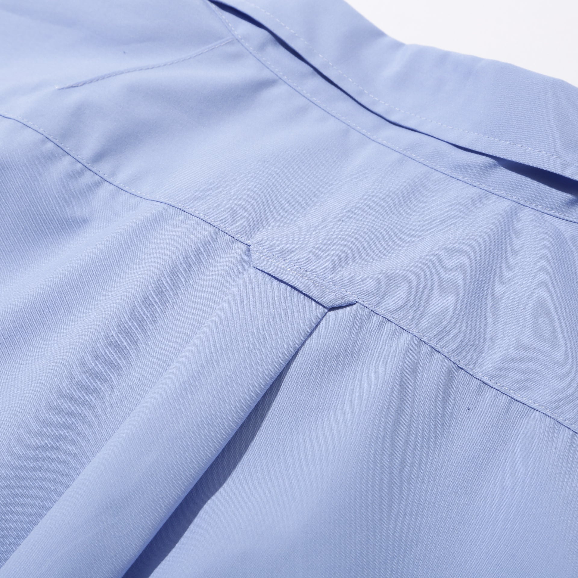 バックヨークのハンガーループ、両脇裾の空環仕上げ(糸残し)、フロント部分の左右がラウンドし重なりのある作り(下着の代わりだったと言われる古いシャツの仕様)など、クラシックなディティールと、アームの立体裁断や胸ポケットのミニマルなステッチワークが共存。