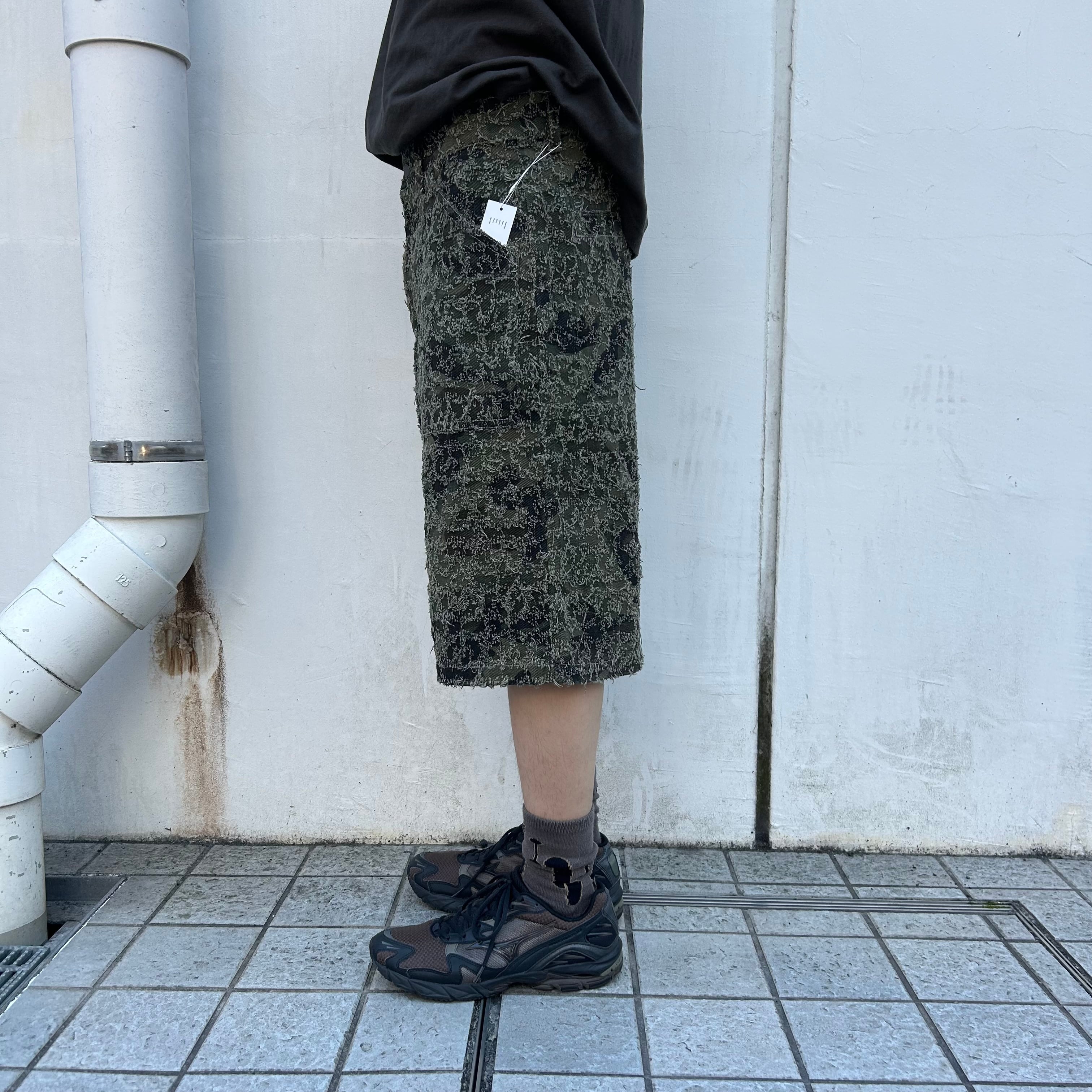 パッチワークデニムとカットジャカードカモフラージュファブリックを使用したボリューム感のあるバギーショーツ。