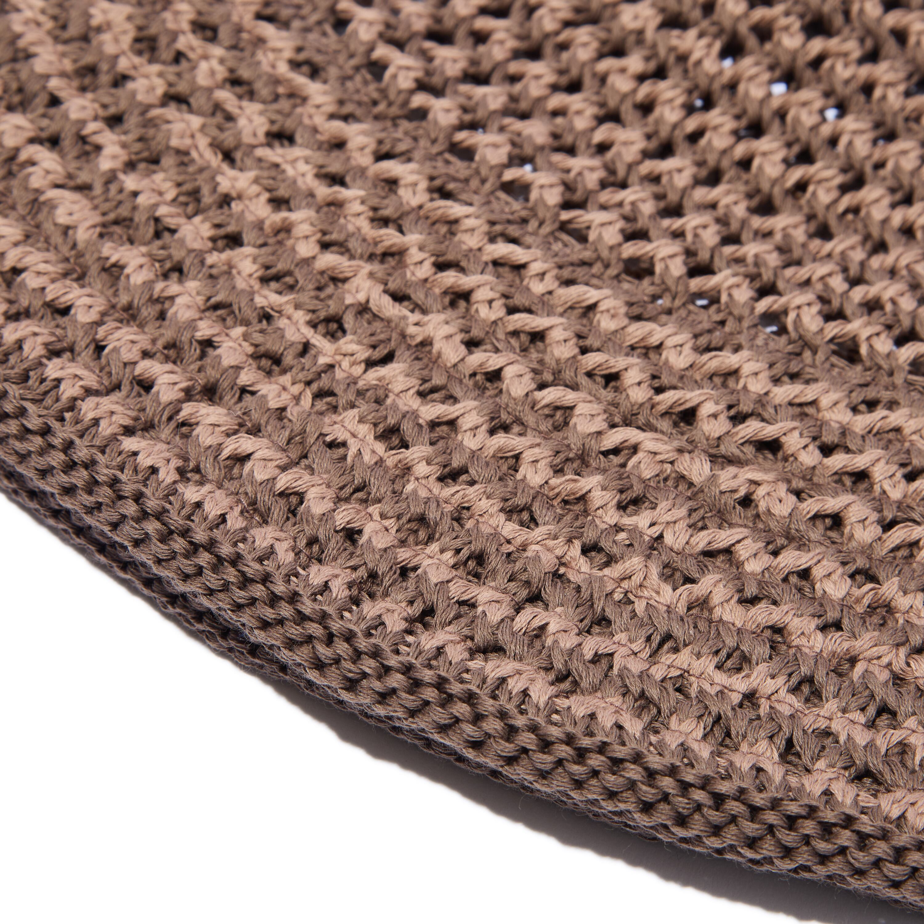 綿コーマに、古くから高級麻織物産地として知られる滋賀県湖東産地の「擬麻(ぎま)加工」を施した糸を使用した2トーンのクロシェニットハット。